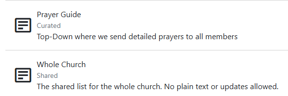 • Curated is for admin-edited prayers to be distributed to many people.  An example is a weekly prayer list to be shared with all church members.