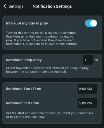 Activate Interrupt my day to pray at the top of the screen. You may be prompted to grant PrayMore permission to give you reminders -be sure to allow it.
