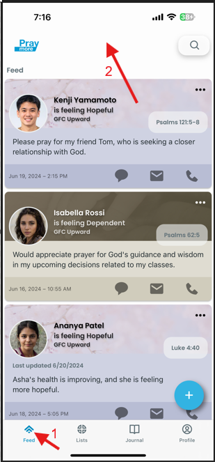 You can confirm that you are on Feed by checking the icon at the bottom left (1). It should be highlighted in blue. The Notification would be visible at the top of your screen (2). The example has the most recent version with no notification.