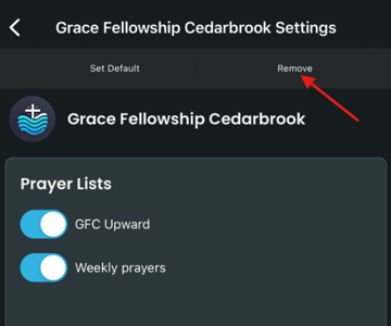 - Go to Profile>Settings and tap on the church/organization that you wish to remove.
