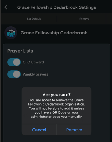 - Tap Remove in the upper right-hand corner. You will be prompted to confirm your choice to be removed from the church/organization.