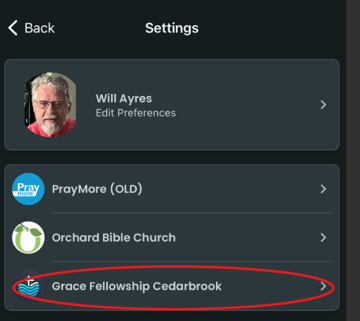 - Go to Profile>Settings and tap on the church or organization in which your group exists.