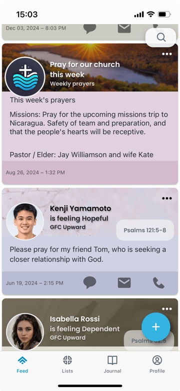 To share a new prayer, make sure you have navigated to Feed or Lists then tap the blue plus button  in the lower right of the screen.