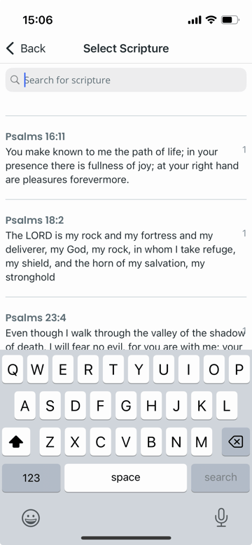 You can select from a number of Scriptures that try to match the text of your request, or you can search for an appropriate Scripture. Sharing Scripture also helps the people praying for you to know better how to pray for you.