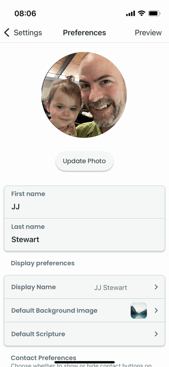To access the Preferences screen, tap Profile>Settings>Edit Preferences. The Preferences screen allows you to set your Profile photo, Display Name, and other settings that affect how other users see your profile in PrayMore.