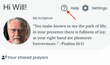 The Help icon is found on the Profile screen. Most of your PrayMore screens will have access to the Profile screen at the bottom right like the example below. Just tap on it and it will take you there.