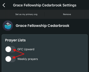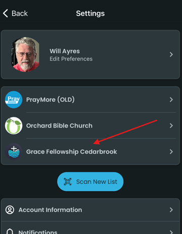 Next, tap on the church/organization with the empty Prayer List(s). In this example we'll select Grace Fellowship Cedarbrook.