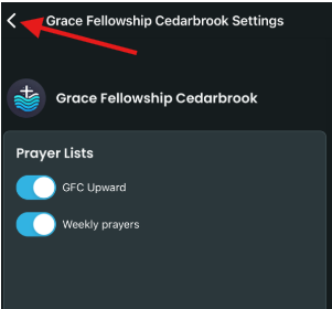 To activate your Prayer List, tap on the slider button to move it to the right side. Confirmation of the change will include the space next to the button filling with blue as seen below. Then, tap on the back arrow at the top left of your screen to see your Feed.