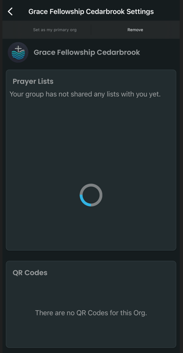 If after tapping on your church/organization from Settings you get a screen with no Prayer Lists, then you must obtain a QR Code from your PrayMore administrator or group leader. Be sure to activate the list as shown above if after using the QR Code your prayer requests still do not appear.