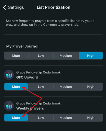 If your Prayer List has Mute highlighted in blue, then that list will not appear in PrayMore. In the example below, two different Prayer Lists are selected.