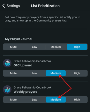 To activate a Prayer List, select among the other choices given: Low, Medium, or High. Your choice will determine the frequency you will be notified from that list as compared to other lists and My Prayer Journal. Medium has been selected for the two lists in the example below.